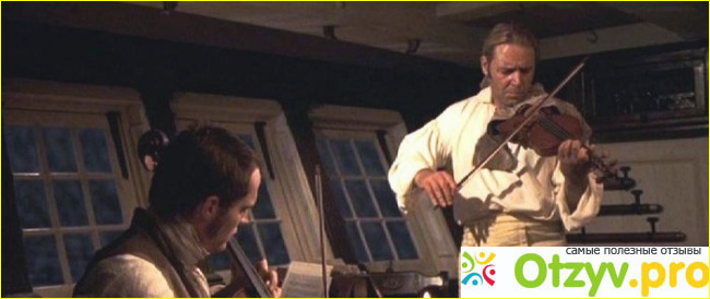 Музыка в фильме достойна отдельной статьи. Она восхитительна. И как же грамотно она вплетена в сам фильм. Поясню по сюжету Капитан, играет на скрипке, а Стивен на Виолончели. И опять же привет первоисточнику, они часто на пару музицировали в каюте капитана, и в фильме это находит, свое отражение, по ходу действия фильма в их исполнении мы слышим пару композиций. Я рекомендую, ценителям классики и фольклорной музыки не поскупится и купить оригинальный саундтрек из фильма, потому как поверьте мне, он прекрасен. Даже тем, кто не смотрел фильм и не собирается его смотреть, но любит звучание скрипки и виолончели.
