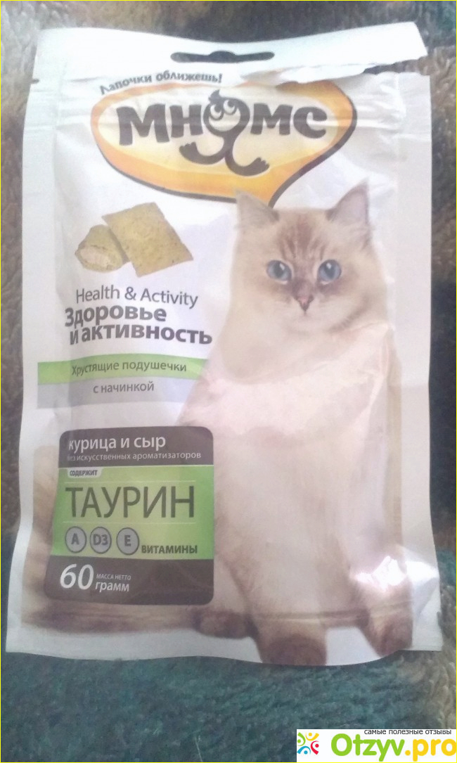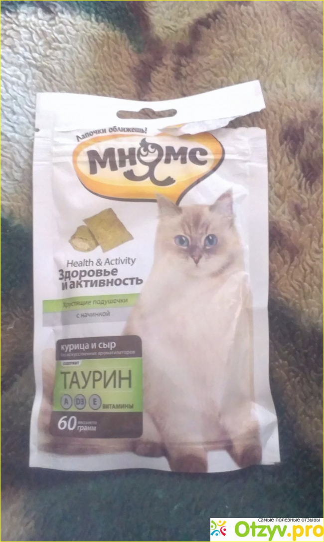 Всем доброго времени суток! Сегодня хочу вам рассказать об витаминном лакомстве для кошек: "Хрустящие подушечки с начинкой " Мнямс", вкус " Курица и сыр". Забавное вкусное название, симпатичная небольшая упаковочка с зип-застёжкой. Австрийское производство.