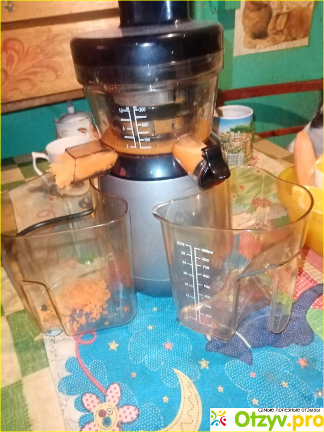 Сок и жмых выходят раздельно в подставленные под них пластиковые емкости (входят в комплект). На емкости для сока есть шкала с миллилитрами, по которой можно оценить производительность соковыжималки на тех или иных продуктах. Больше всего сока выходит из винограда и твердых яблок, на втором месте апельсины и огурцы, потом идет сельдерей, а затем морковь и свекла.