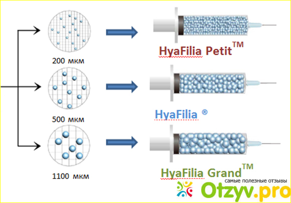 Производитель предлагает потребителю три типа своей продукции в зависимости от того какую проблему надо решить. Первый вариант - Hyafilia Petit. У этого геля мягкая консистенция. Его используют для наполнения маленьких поверхностных морщинок и деликатных областей таких, как гусиные лапки, контуры губ, носослезная линия. Косметолог вводит гель этой марки на совсем маленькую глубину. Второй вариант - это гель Hyafilia. Он имеет среднюю плотность. Таким гелем обычно корректируют мелкие и средние морщинки, делают губы объемными, заполняют складки между носом и губами, между бровями, корректируют некоторые участки тела. Этот гель косметологи обычно вводят субдермально. Третий вариант - это Hyafilia Grand. Это гель довольно плотной консистенции. Используется он для коррекции подбородка и скул, височных впадин. Специалист делает инъекции в глубокий слой дерьмы. Плотность геля зависит от размеров молекул гиалурованой кислоты и плотности их связывания. Выпускаются в двух модификациях. Первая - одно чистое вещество, вторая модификация дополнена лидокаином. Продажа этих гелей осуществляется в герметических шприцах с объемом один миллилитр. Цена на филлер довольно высокая и составляет две с половиной тысячи рублей. Покупать желательно у продавцов с хорошей репутацией.