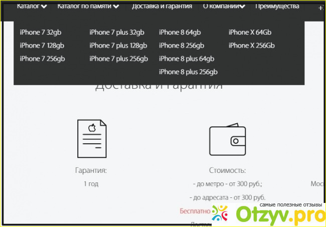 Сверху мы можем ознакомиться с главным меню. Причем тут имеется необычный каталог продукции. В первом пункте каталога идет разделение по моделям айфонов, а во втором пункте идет другая сортировка по размеру памяти.