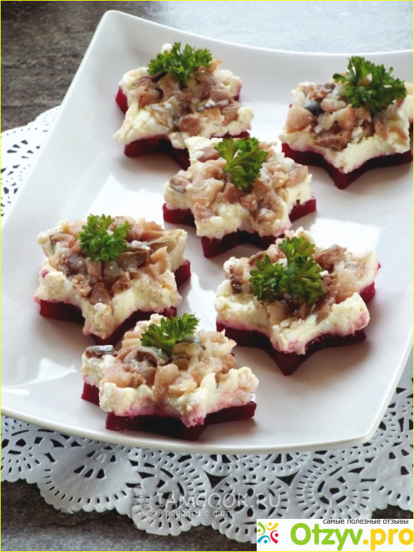 Все ингредиенты хорошо перемешиваем и выкладываем на кусочки бородинского хлеба, или как я, на красиво вырезанные кусочки варёной свеклы, сверху присыпаем нарезанным зелёным луком.