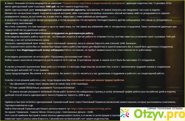 А раз так, то конкурс на место наборщика текста - очень высок. И чтобы попасть в ряды хорошо зарабатывающих в Издательстве "Версия", надо внести залог. И это 1000 рублей. Возможно кто-то и подумал, что немного, зато за неделю я в семь раз больше смогу заработать. И бегут с деньгами к платежному терминалу.