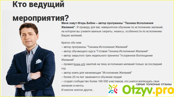 Много проплаченных отзывов про тренинги Игоря Бибина в сети, нужно же заманить в свою сетку новых жертв. Из всех роликов этого шарлатана на Ютубе вы поймете, что вас гипнотизируют. Если подойти к просмотру с негативом, то можете прочувствовать, что никакой конкретики в словах Бибина нет. Отчим стал очередной жертвой этого мошенника. Существует много бесплатных способов и инструментов, как научиться исполнять свои желания. Послушайте интересные материалы В. В. Шахиджаняна, автора программы "Соло на клавиатуре". Вот у него действительно полезный контент и очень много интересных книг о том, как правильно идти к своим целям. Психолог от Бога, который помог мне исполнить одну из мечт - научиться писать слепым десятипальцевым методом.