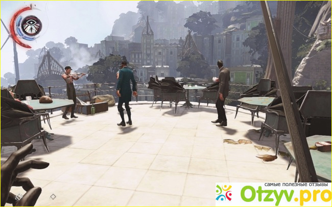 Локации - в игре 5 миссий, но получились они куцыми. Первая локация состоит из длинного коридора и двухэтажного здания. Вторая миссия - это большой город Верхняя Кирия, где действительно можно разгуляться, активно исследовать мир и все в стиле любимой игры. Но третья миссия тоже частично проходит в этой локации, только в вечернее время. Не очень приятно повторно играть в том же месте. Потом мы, правда, переходим в здание и играем там, но осадочек остается. В четвертой миссии тоже решили не заморачиваться, а просто вернули в Кунсткамеры из Dishonored 2, лишь немного иначе поставив предметы внутри. Так что особого разнообразия в локациях не ждите.