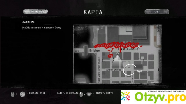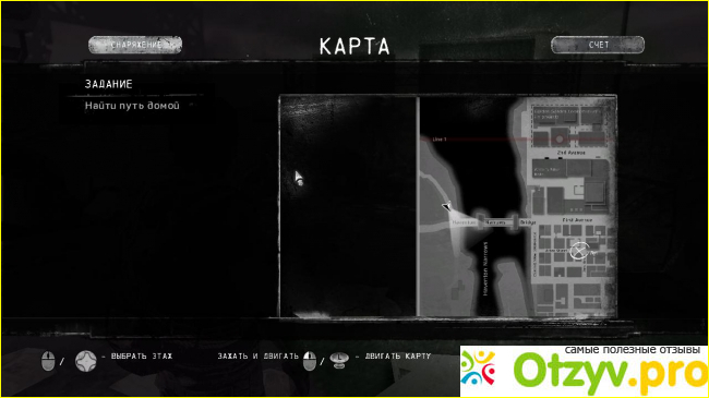 Довольно оригинально выполнена карта. Изначально она показана как есть, т. е. до катастрофы. И только личным исследованием территории можно обнаружить, что на главной улице огромная дыра и там не пройти, нужно искать обход. Все помечается на карте красными "рукопистными" отметками.