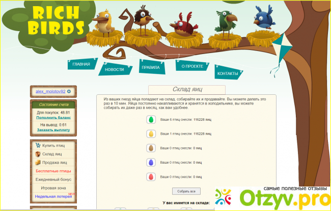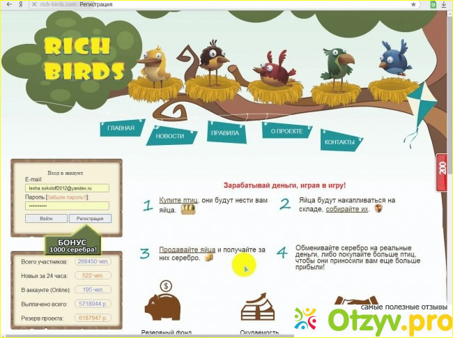 На других финансовых пирамидах всё понятно, вам пишут какой процент и когда вы получите. Тут же всё сложнее. Создатели придумали птичек, что бы платить вам ещё меньше. Привлекают внимание бонусом в 1000 серебра, что является ровным счётом - ничем. Типа акции, и прочее завлекуха, что бы вы внесли денежки и озолотили создателей. Даже подробно опишу. есть птицы, которых нужно покупать, птицы несут определенное кол-во яиц, которые вы обмениваете на серебро, серебро меняете на деньги. Первая бесплатная птицы несет 100 серебра в час. Следующая по рангу 600 в час. следующая 3200 в час. Давайте подсчитаем, как вы можете окупить свои средства. К примеру вы вводите 1000 рублей. Вы покупаете синюю птицу. Она несёт вам 14000 яиц в час. Умножаем на 24 часа в сутки и на 30 дней в месяц, получаем 10 миллионов яиц. Продаем яйца и получаем 100 000 серебра. При чем оно делится на 2 части. 50 тысяч для новых птиц, 50 на вывод. А 50 тысяч серебра на вывод - это 50 рублей, круто да? то есть 1000 рублей вы вернете через 20 месяцев. Конечно если активно использовать сервис и постоянно на накопленные средства покупать новых птиц, то 1000 рублей вы окупите через пол года, но разве это нормально? Про это ясно. Сам же сайт полнейшая фигня, выполнен кошмарно, никаких защит данных, никаких подтверждений личности, несмотря на работу с деньгами, никаких гарантий, никаких адресов. Служба поддержки на самом деле не работает. Ужасный сайт.