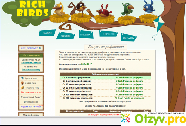 Итак, rich birds - это сайт, который объявляет себя средством заработка. Работает он по принципу финансовой пирамиды, сейчас поясню, что это значит. Владельцу сайта необходимо иметь начальный капитал для развития проекта, причем не малый. Он создаёт проект, и тратит много денег на раскрутку, рекламу. Часть денег ему требуется на работу самого проекта. Сайт предлагает нам заработать на инвестициях, ведь без них у вас и отдачи не будет. Вы вкладываете, ваши проценты медленно но верно растут, вы через некоторое время выводите заработанные средства. А сайт работает так, создатель по максимуму раскручивает проект, люди вкладывают деньги, и пока первые люди вкладывали, а их проценты очень, очень медленно копились, пришли следующие люди на сайт. И с инвестиций новых людей часть денег сайт выплачивает старым пользователям. Понятна система? К примеру, я первый кто зашел на сайт, и я кинул туда 5000 рублей, потом зашел кто то другой, и выложил тоже 5 тысяч рублей, пока копились мои проценты, у владельца проекта уже есть деньги, что бы выплатить мне заработок. А поскольку проценты на этом сайте идут очень, очень медленно, можно успеть выплатить всё и всем. Но вы спросите, что не может ведь такой проект жить вечно, и как зарабатывает создатель? Все просто. Владелец проекта использует реферальную систему, это значит, что с новых инвесторов, которых привлекли вы, вам идёт процент, небольшой. А реферальная система Пятиуровневая, значит, что он последующих рефералов, которых привлекли ваши рефералы вам тоже процент. А сделано это для того, что бы вы стремились привлекать на сайт людей всё больше и больше. И по сравнению с тем, какой наплыв инвестиций идёт на сайт, реферальный процент - это ничто, он только в плюс сайту. И вы без рефералов толком ничего не заработаете, и сайт без новых инвеститоров падёт крахом. А на первый вопрос "не может проект работать вечно", ответ просто, нет не может. Когда владелец сайта поймет что сумма затрат выше, чем сумма инвестиций, то проект закроет, а все свои миллионы оставит в кармане. Так что вы рискуете своими деньгами. Ваши деньги никто не защищает. И даже если вам сайт не выплатит ваш заработок, что очень вероятно, то никто вам не поможет. Абсолютно никто не вернёт вам ваши деньги, а доверие сайту минимальное, так что не советую вкладывать много денег, только если вам совсем их не жалко.