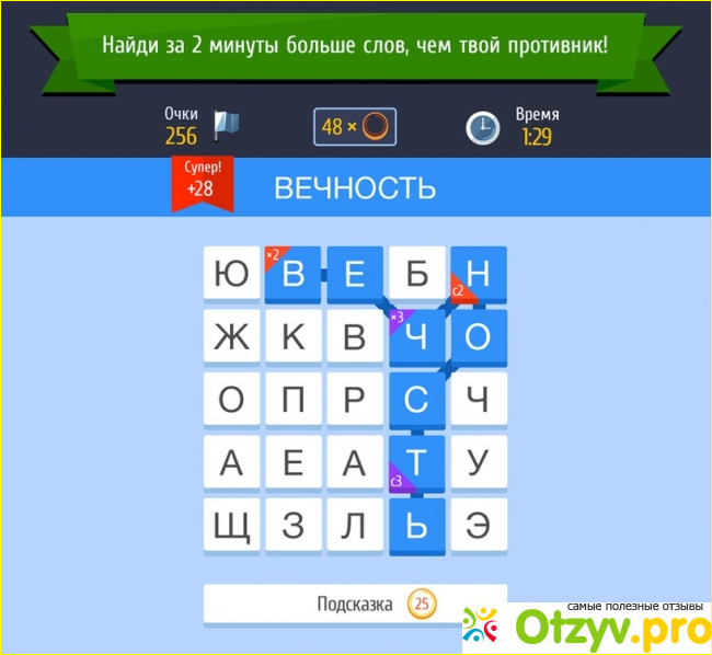 Основная задача игры заключается в том, чтобы победить своего соперника в игре. Нужно отыскать больше слов, чем твой оппонент. Одна игра состоит из трех раундов. Один раунд длится всегда две минуты. На картинке отмечен первый раунд, который мы уже завершили. Здесь можно просмотреть количество слов, которые нашла я, а также какие слова нашел мой противник по игре. Тут я проигрываю пока.