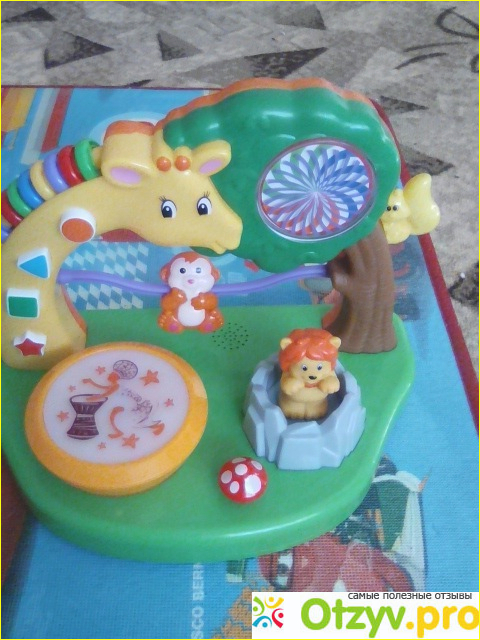 Лев смешно проваливается в ямку и обратно поднимается при нажатии. Белочка, которую можно опускать, а она поднимается и издает звук похожий на трещетку. Обезьянка висит. Ее можно крутить. Жираф ничего не делает. На нем есть фигурки разной формы: квадрат, треугольник, звезда, круг. Каждая форма фигурки окрашена в разный цвет. При нажатии говорят цвета и форму фигурки. С боку счета есть. На мой взгляд такую игрушку можно дать ребенку раньше года. Пока маленький он может просто ее крутить, а повзрослей уже произносит цвета.