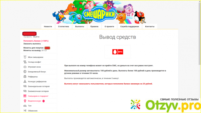Это бы еще не все. Третьего марта я прочитала, что действия жизни смешариков кончаются и их жизни заканчиваются через десятков дней. Потом придется их докупать. Сегодня шестого марта я хотела уже снять свои монеты на вывод. Расскажу о принципе их действий. Каждый день я забирала монеты и бонусы. Сейчас у меня 237 монеты на покупку смешариков и 483 монет на вывод. Чистыми 483 монет вы не получите. Потому игровой курс равен - 100 монет на вывод=1 рублю. Поэтому решила снять хотя бы 4 рубля 83 копейки. Но я вконец офигела, когда я должна еще дополнить деньги на свой баланс до 25 рублей, чтобы вывести свои несчастные почти 5 рублей.