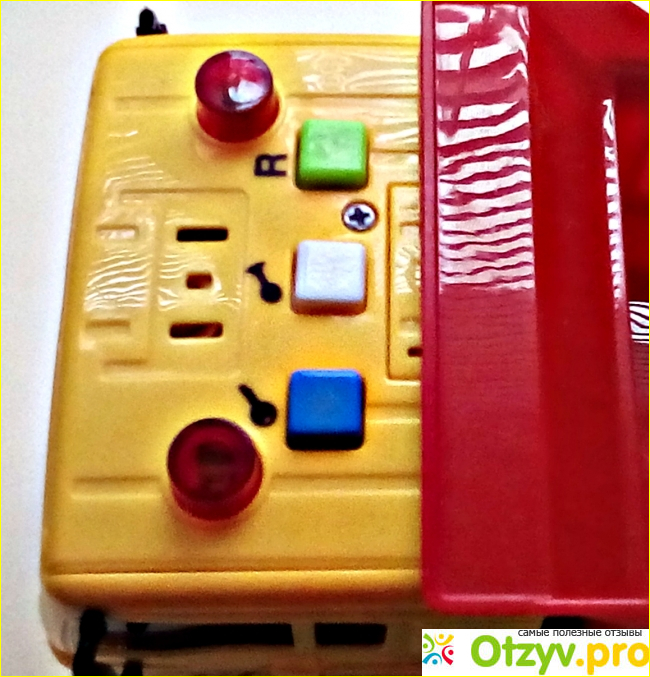 Сверху на кабине 3 кнопки и 2 маячка. Маячки светятся. При нажатии на кнопки можно услышать разный звук. Звук довольно громкий. Через некоторое время он выключается сам.