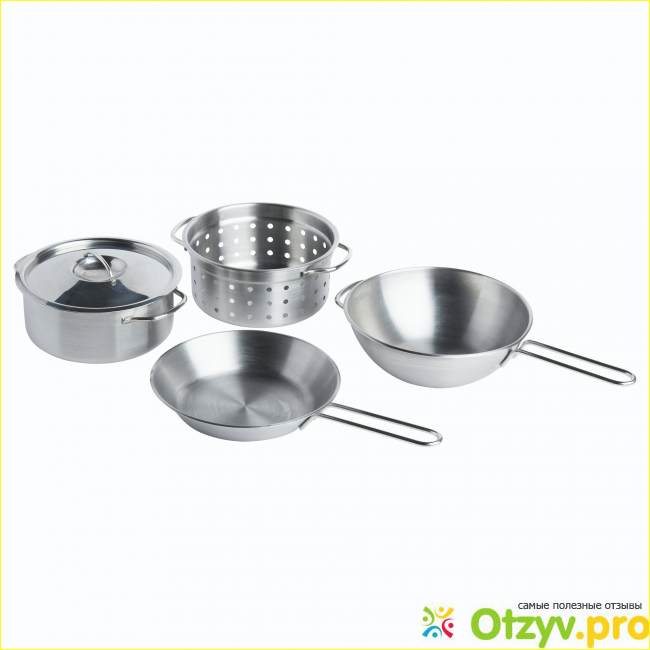 В наборе идет 5 предметов: сотейник, сито, кастрюля, сковорода и крышка. Маленький минус для меня: крышка подходит только для кастрюли. Первое время дочка пыталась ею закрыть сотейник, сковороду и когда у нее не особо это получалось, начинала нервничать. Сейчас уже привыкла. Крышкой пользуется редко.