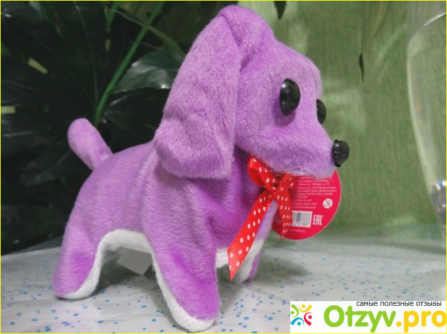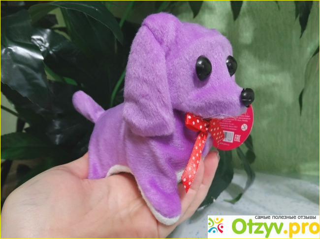 Когда включаешь эту игрушку собачка начинает ходить взад вперед и лаять. Лай больше похож на пищание птички и довольно громкий. Наша дочка просто в восторге от этой игрушки. Приносит ее и показывает чтобы включили, а вот сегодня уже включила ее сама.