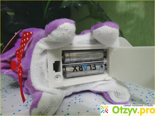 По размеру игрушка не большая. Самое то для ребенка в полтора годика. Работает от двух пальчиковых батареек.