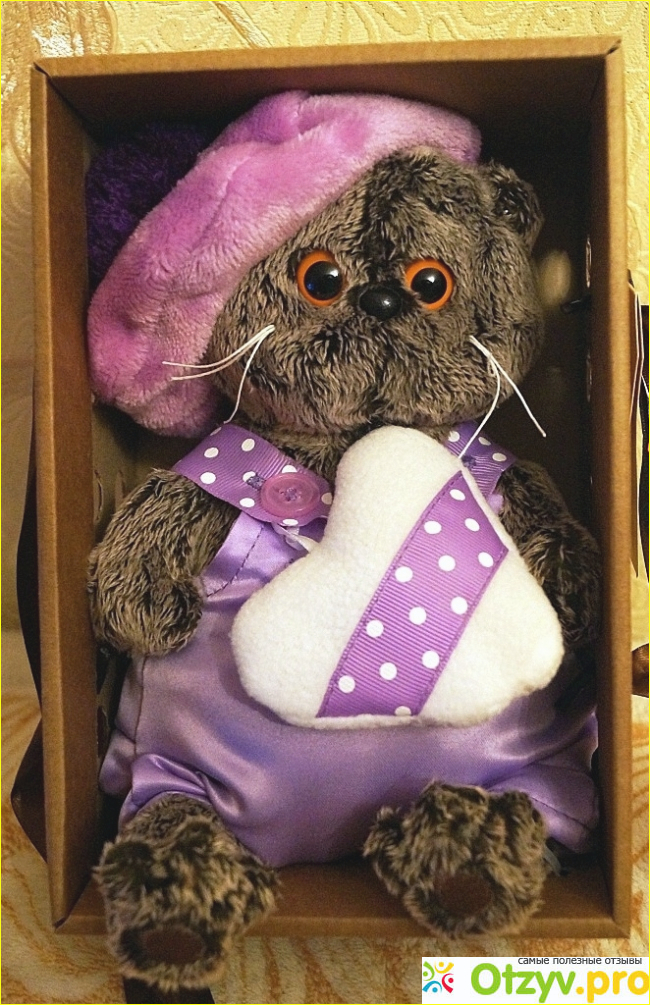 Все коты Басики имеют абсолютно разную одежду. Там есть и свитера, и майки, и комбинезоны, и также какие-то необычные одежды. Мой вариант является вариацией необычной одежды. У мягкой игрушки можно наблюдать Флорентийскую шапочку и комбинезон того же цвета. К передней части игрушки пришито сердечко такой же расцветки. Мне понравилась именно эта униформа игрушки, но выбрать мог я и любую другую!