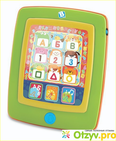 Начну с того, что нам его подарила крестная, такой штуки у нас в магазинах не видела, но кума у нас чудо - умудрилась найти. Ребёнок был в восторге от подарка, теперь у него свой планшет, более красочный и музыкальный. При касании на кнопки, активируются соответствующие функции: звуки, голоса животных, буквы и цифры.