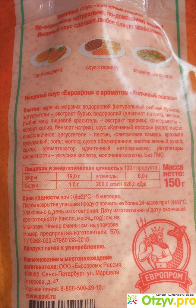 Замечу, что использовать икорный соус Европром очень удобно, потому что он выпускается в мягкой 150-граммовой пластиковой упаковке с крышкой, которая позволяет выдавить все ее содержимое до последней «икринки». Стоит такой соус не очень дорого, всего-то 55 рублей, а найти его можно на прилавках многих продуктовых супер- и гипермаркетов. Конечно, это соус не на каждый день, но иногда, когда хочется разнообразия, его вполне можно доставать из холодильника и творить с ним различные кулинарные шедевры.
