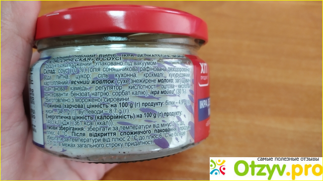 Состав икры хороший, вредных добавок там нет. Кроме самой икры мойвы есть соус. Соус что-то наподобие майонеза, его основа это подсолнечное масло.