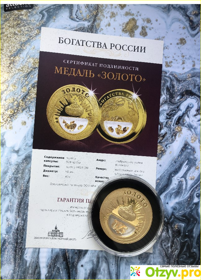 шикарный дизайн с шапкой Мономаха на аверсе. приходит в пластиковой коробочке и сертификатом. сама медаль не золотая, а позолоченная. но есть воздушная капсула, в которой находится несколько крупинок настоящего золота в том виде, в котором его добывают. теперь жду не дождусь следующие монеты из коллекции с природными богатствами страны.