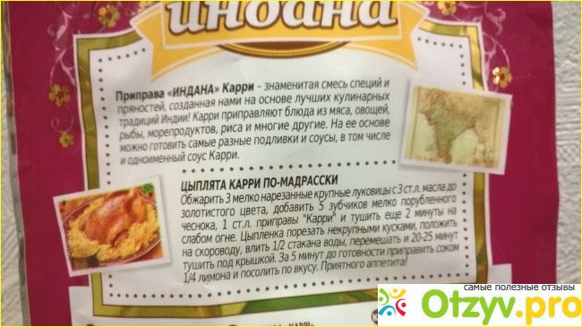 С обратной стороны полностью перечислен состав, написано, в какие блюда карри лучше всего добавлять и даже есть рецепт цыплят карри по-мадрасски. Открываем упаковку, внутри однородная смесь желтого цвета с вкраплениями крупной морской соли. Запах ароматный, пряный. Добавила карри к курице, мясо получилось очень ароматным, не острым. Мне очень понравилось. Резюмирую, приправа достойная, с хорошим составом. Буду брать еще приправу этого производителя, посмотрела в приложении ленты кстати, у Инданы приправ разных и специй на любой вкус. Уже выбрала, что куплю следующей, приправу для морепродуктов, интересно оценить.