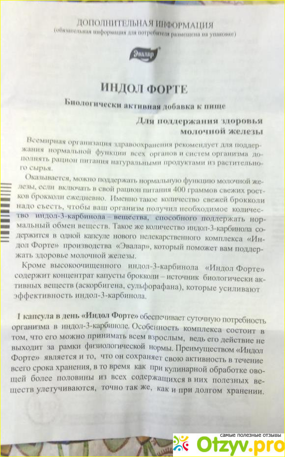 "Индол форте" полностью покрывает суточную потребность в необходимых веществах, которые содержатся в капусте. Как считается, необходимо употреблять каждый день не менее 400 г капусты брокколи для здоровья женской груди, но понятно, что это невозможно: вряд ли женщина будет питаться одной капустой в таких количествах.