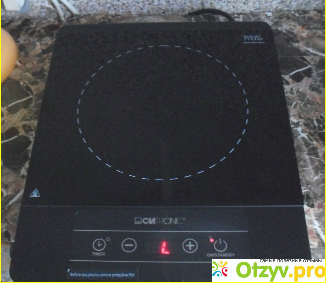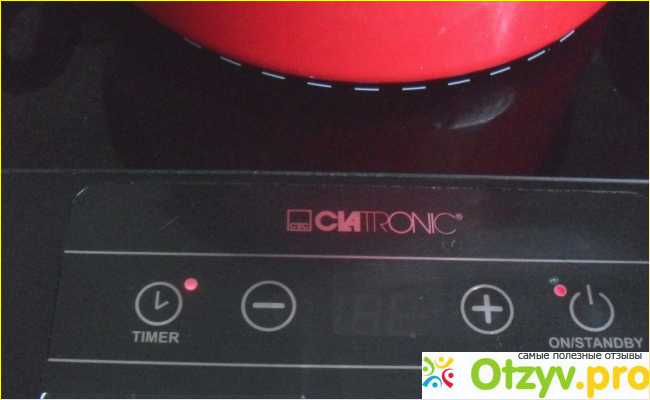 Включается плитка самой правой кнопкой, интенсивность готовки устанавливаем кнопками "минус" и "плюс". Есть таймер, и можно задать время готовки в пределах часа. Так же сначала нажимаем самую левую кнопку и кнопкой "плюс" устанавливаем время.