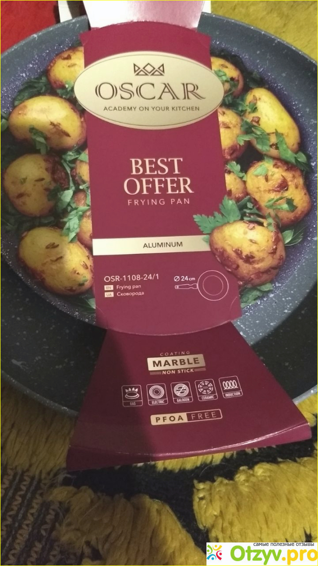 Увидев на сковородке значок индукции, я обрадовалась и решила приобрести. Все как положено: проверила, дно магнитится, значит подойдет. Диаметр посудины 24 сантиметра, вполне нормально. Сковорода серого цвета, алюминиевая с железным магнитящимся дном. Ручка из бакелита тоже серая. На этикетке на малиновом фоне нарисован довольно таки аппетитный картофель, посыпаный зеленой петрушкой и написано назввание фирмы производителя и модели. Там же внизу надписи, для каких плит подходит: газовая плита, электрическая, галогенная, керамическая, индукционная.