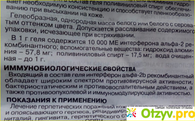 Препарат служит только для наружного применения. Относится к противовирусным средствам. Действующее вещество имеет очень длинное наименование — интерферон альфа-2b человеческий рекомбинантный. Так же есть и другие вспомогательные вещества, которые я не буду здесь перечислять. Препарат обладает широким спектром по подавлению различных вирусов и бактерий. У него ярко выраженный противовоспалительный эффект, а также он выступает, как иммуномодулирующие средство.