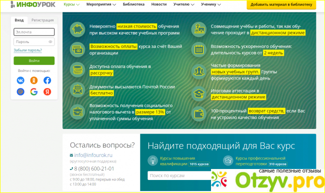Начнем с самого начала: официальный сайт Инфоурок представляет собой онлайн сервис, который предоставляет пользователям возможность получить знания, образование и повысить свою квалификацию. И для этого не нужно куда-то ехать, все можно сделать не отходя от своего компьютера или ноутбука у себя дома. В базе Инфоурок насчитывается примерно 298 наименований курсов для повышения квалификации, 184 индивидуальные программы профессиональной подготовки. Также здесь можно найти онлайн уроки, которые ориентированы для всякого желающего улучшить свои познания в иностранных языках, IT обучению, здоровью, красоте и тому подобное.