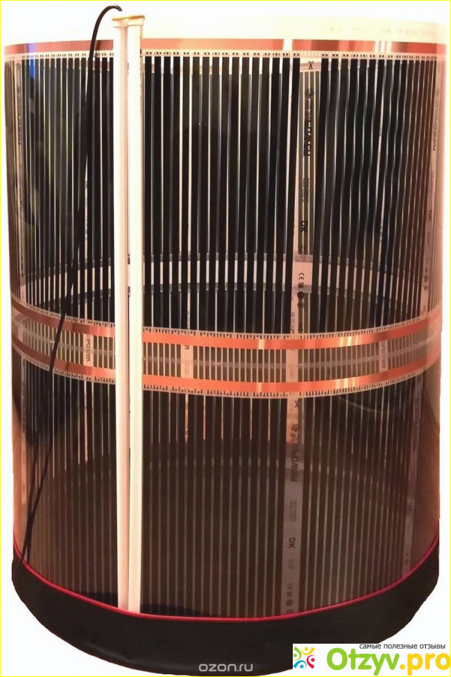 В комплект входят такие элементы, как: инфракрасная пленка с планками (250 на 150 см), провод питания, длиной в 1,7 м, «ушки», сделаны с пластического материала, крышка и днище, размером в 80 см, инструкция к применению.