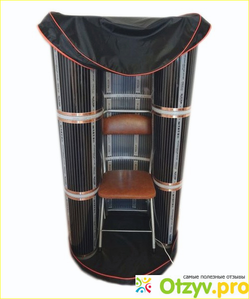 Перед сборкой конструкции внимательно прочитайте инструктивные указания. Для начала нужно положить на пол круглое дно, но таким способом, чтобы края были наверху. Далее поставить стул по центру, инфракрасную пленку поместить в днище электрошнуром кверху. Немного прикрыть верх крышкой, включить провод в розетку, пластиковые ушки соединить вместе, расправить пленку, подправить верхнюю крышку.