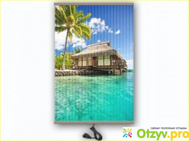 по принципу инфракрасного излучения, которая схожа с солнечным теплом. Производитель обещал малое энергопотребление. Потребляет четыреста, четыреста пятьдесят ватт. Разогревается этот пленочный обогреватель до температуры от сорока пяти до восьмидесяти градусов. Греет обогреватель хорошо, от него веет теплом как от печки Греет только с одной цветной стороны, с изнаночной стороны не нагревается. Стена почти холодная. . Хотя производитель и утверждает, что обогреватель безопасен, то я бы не рисковала оставить его без присмотра. При покупке мы надеялись не только на обогрев помещения, а еще и на значительную экономию денег. Наш пленка обогреватель выглядит очень эстетично. На нем изображены разные картинки. На нашем море с пальмами. Их разнообразие радует. Очень разные красочные картины. Воздух в помещении он не сжигает и не перегревает. Дышится от него легко. Поэтому в комнате комфортная температура и не холодно, но и не слишком жарко Это особенно классно, когда еще нет централизованного отопления и в комнате холодно. Тогда это просто спасение. . Обогреватель пленка занимает мало места, он легко скручивается в рулончик если в нем нет необходимости. Его легко может перенести из комнаты в комнату, даже ребенок. Когда возникает потребность в обогреве, я или кто то из семьи его разворачивает, вешаем на гвоздик. И осталось только включить в розетку. На этом наша работа закончилась, а обогреватель начинает работать. Если к нему прикоснуться, то можно почувствовать только легкое тепло. Не надо опасаться, ожога вы не получите. В комнате буквально за несколько минут становится теплее, Он нагревает стены, мебель, пол, но не воздух и это все сохраняет тепло даже во время проветривания комнаты. У нас комнаты в доме не очень большие поэтому тепла хватает. Но если помещение большое то я думаю, что нужно использовать 2 пленочных обогревателя. Через два месяца после использования первого обогревателя мы заказали еще один себе в другую комнату. Наши общие знакомые тоже купили его когда увидели результат у нас.