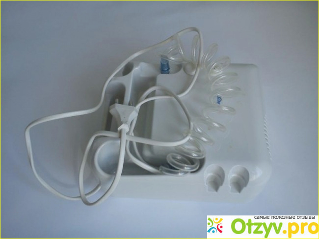 В наборе идет компрессор, длинная закрученная трубка, затем две насадки для лекарства, две маски и одна из них для ребенка, другая для взрослого.