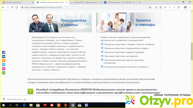 Будет интересен сайт и тем, кто не планирует продавать-покупать-сдавать-снимать свое личное жилье или другую недвижимость, но хочет это делать для других и чувствует, что у него это получится. Для таких людей есть раздел под названием "Карьера" с подразделами "Вакансии" и "Учебный центр". В разделе "Вакансии" можно узнать, какие специалисты сейчас требуются, к слову сказать, компания "Инком-недвижимость" такая огромная, что вакантные места там есть практически постоянно.