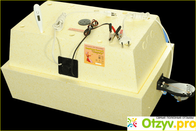 Еще одним достоинством такой модели является автоматических переворот яиц. Переворот яиц осуществляется до десяти раз в сутки. Благодаря этому яйца отлично прогреваются со всех торон. А также данная система позволяет получать потомства от яиц различного размера. По мимо этого покупатель в наборе получает еще спиртовой термометр. который можно проверять нужную температуру.