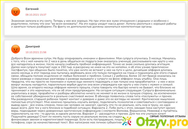 Но и это меня не остановило, я изучила множество отзывов от реальных людей, не подставных, которые распространяют фейковые отклики и новости. Народ почему-то называет ее курсы…сектой. Но почему сектой? Или не только я думаю, что она как Кашпировский, зомбирует людей? Пишу на основании прочитанных откликов от людей и просмотренных видео: большинство людей начинают лезть в кредиты/долги, занимать деньги, чтобы…посетить ее курсы! Начинают навязчиво рекомендовать эти курсы всем подряд (напоминает секту “А вы верите в бога!?” Многие заметили, что человек изменяется с психической стороны, не в лучшую сторону, и это чаще стали замечать их родные.