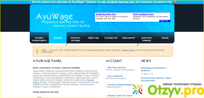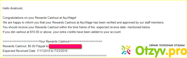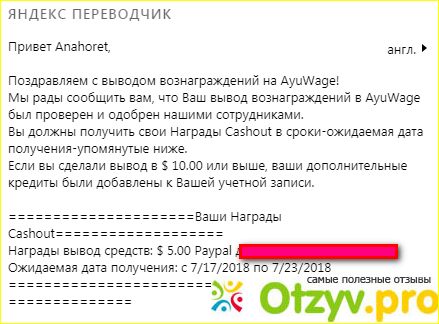 Далее переходим в меню "Обзор", (12 -24 кредитов). Нужно перейти на сайт и совершить на нём два перехода, каждый раз возвращаясь на страничку ayuwage и вставляя на нём ссылки на посещенные сайты. "Регулярный" (10 - 60) нужно побыть на сайте 10 сек, после чего щёлкнуть по одному любому баннеру, рекламе. Следующий, "Исследовать", нужно посетить и ввести на сайте два внутренних адреса с сайта и один внешний - рекламный. Если кому будет что непонятно, описание порядка работы есть в интернете. Оплата должна поступить в течение недели, если что не так, пишите администрации. У меня деньги пришли на 10-й день. В заключение привожу скрин подтверждения оплаты, пришедший на почту, и его перевод.
