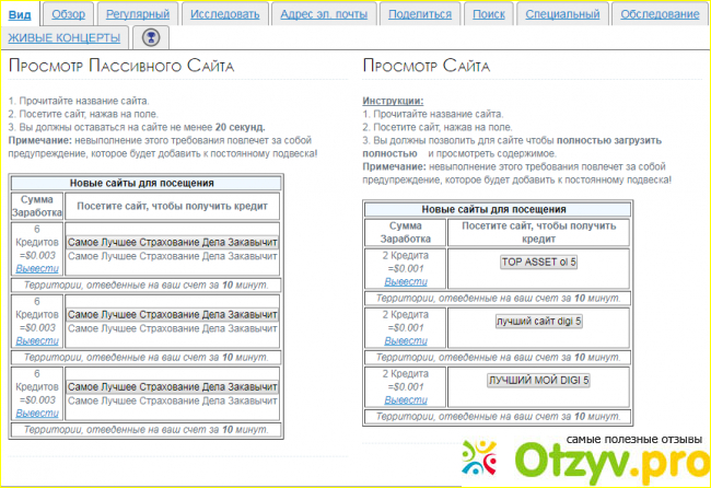 17/07 я на сайт не заходил. Если будет перерыв больше месяца, кстати, Вы получите бан. Затем переходим к выполнению заданий: жмём последовательно "Вид". Откроется список сайтов для посещения. В левой колонке сайты, которые нужно просматривать минимум в течение 20 сек. В правой простой просмотр. Стоимость 12 баллов в первом и 2 во втором.