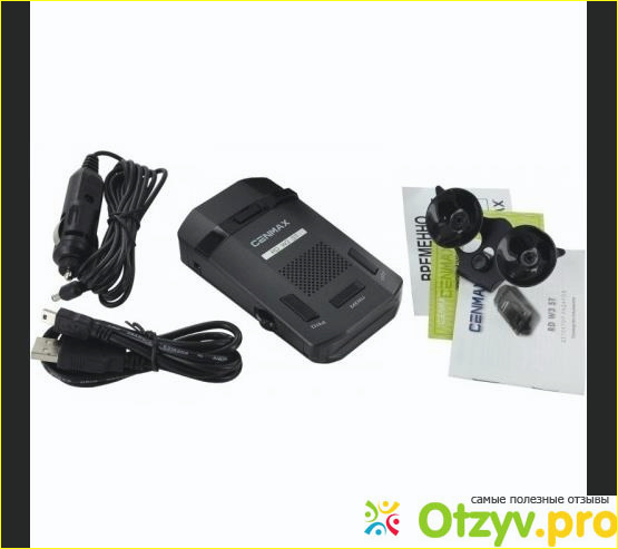 Inspector Cenmax RD W3 ST, Black радар-детектор сделан в Китае, по способу крепления он держится на специальной присоске, как и многие антирадары. Питается он от автомобильной сети. В комплект к антирадару входят еще держатель для него, запитывающий кабель, кабель USB, а также инструкция по применению.