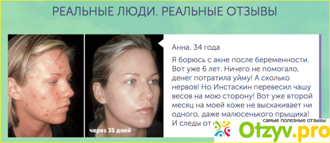 "После родов у меня начало обсыпать прыщами всё лицо, я стала очень комплексовать по этому поводу и всячески боролась с ними. За пол года я перепробовала массу разных способов, начинала с народных методов и заканчивала дорогими средствами. Когда же я окончательно опустила руки и смирилась, мне моя подруга показала информацию о креме Инстаскин, не совсем доверяя положительным отзывам, я всё же рискнула его приобрести и сделала это в интернете, чтобы быть уверенной что это не подделка, а оригинал. После того, как я его получила, стала наносить придерживаясь инструкции, первый результат я заметила спустя пять дней, прыщи посветлели и мелкие начали исчезать, а после месяца применения кожа стала абсолютно чистой, ровной и без единого прыща, я результатом довольна. Прошло три месяца и никаких высыпаний нету."