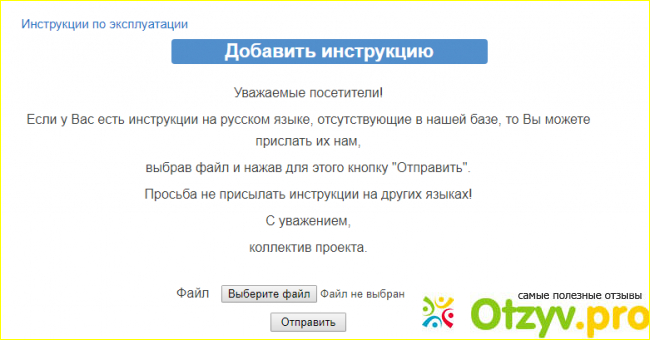 Сразу под названием сайта можно найти две строчки, в одной администрация сайта предлагает свои услуги по поиску и размещению инструкции на ресурсе. А вторая строчка говорит о том, что любой желающий может помочь в развитии сайта и прислать инструкцию по применению для администраторов сайта.
