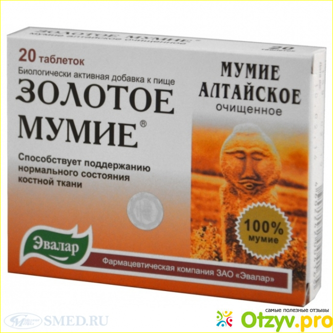 Решив начинать лечение при помощи алтайского мумие, я обратилась за советом в аптеку. Мне рассказали, что мумие можно купить как в форме таблеток для внутреннего применения, так и в форме крема. Для начала я решила попробовать таблетки и купила БАД «Золотое Мумие» от Эквалар. Но, честно говоря, эффекта для меня от него не было. Хотя на упаковке указано, что это средство прежде всего для укрепления костной ткани. Так что вполне возможно, эти таблетки помогут тем, к кого слабые кости или беспокоят боли в пояснице.