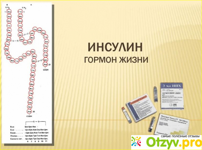 Инсулин представляет собой белок, состоящий из двух цепей, цепи A (с 21 аминокислотой) и B-цепи (с 30 аминокислотами), которые связаны атомами серы.