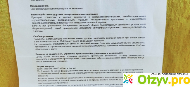 Случайно задела контейнер с мелким мусором и оказалась в облаке пыли. Вечером глаза начали немного чесаться, затем увидела покраснение, началось слезотечение. Вероятно, все-таки случайно занесла в глаза инфекцию, хотя старалась не тереть их руками. В аптеке попросила провизора посоветовать препарат, она порекомендовала Интерферон-Офтальмо.