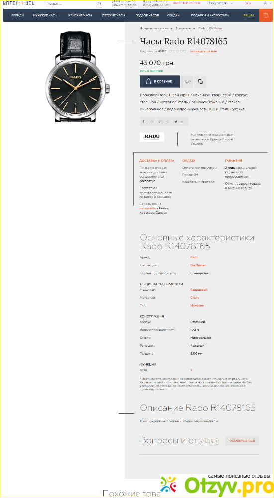 Карточки товара оформлены удобным для покупателя образом, в них указаны параметры часов и фото модели, нюансы оплаты и доставки. Под этим товаром так же предложены похожие товары которые могли бы вас заинтересовать.