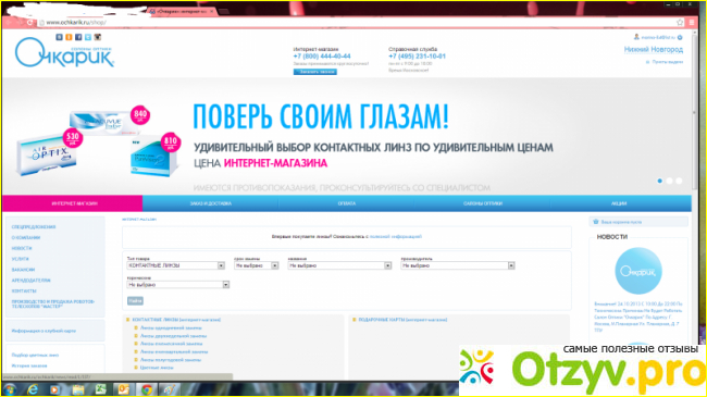 Для того чтобы делать заказ на этом сайте, необходимо зайти в раздел интернет-магазин. Потом выпадет окно, где необходимо выбрать свой тип линз. Лучше всего выбрать по сроку замены, к примеру один день. Это самые тонкие, и самые безопасные для глаз линзы, на которых скапливается минимум бактерий. Сайт, в автоматическом режиме выдаст все возможные варианты однодневных линз. К самым популярным видам линз этого магазина являются линзы от Johnson & Johnson, но лучше всего довериться мнению вашего врача. Потом необходимо кликнуть на нужные, и появится страница товара. Далее, нужно выбрать нужные параметры кривизны и оптической силы и нажать Купить. Далее, сайт предложит зарегистрироваться, если вы этого еще не сделали или активизироваться. На следующей странице выбираем свой город, свое имя, а также номер телефона если этого нет, и выбрать способ доставки и оплаты. Подробнее об этом я напишу ниже.