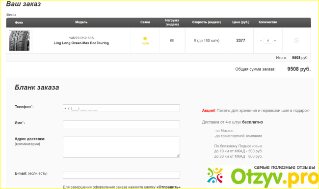 Например, мы решили приобрести шины Ling Long Green-Max Eco Touring 145/70 R12 69S, нажимаем на эту картину, и попадаем на полное описание его технических параметров. Там предлагается обзор шины с его техническими характеристиками, стоимостью и возможность его приобрести по стоимости по 2377 рублей. Если вы задумались его приобрести, кладем в “Корзину”, далее оформляем бланк заказа, указываем там: телефон, имя, адрес доставки, электронный адрес (если есть), и отправляем.