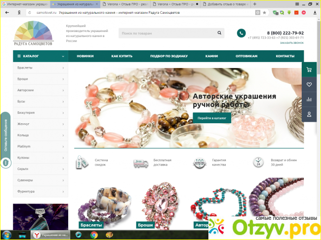 Мне посоветовали заказывать через интернет-магазин Радуга самоцветов. У них очень большой ассортимент украшений, а так же есть много разнообразной красивой фурнитуры. Из представленного ассортимента есть буквально все, а именно украшения, изготовленные с камнями, жемчугом, есть серебро, простые украшения, с добавлением бисера, имеются в продаже бусы, браслеты, кольца, колье, цепочки с подвесками, серьги, кулоны и так же элитная бижутерия, сделанная авторами оригинальная.