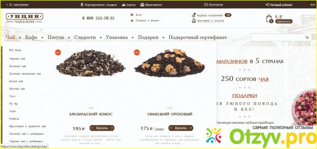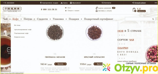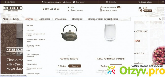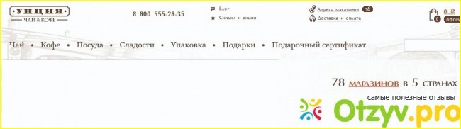 Итак, сайт магазина "Унция" оформлен в консервативном стиле, но это, скорее, полюс, потому что главное - это фотографии и описание чая, кофе, посуды, фотографии вариантов оформления подарков.